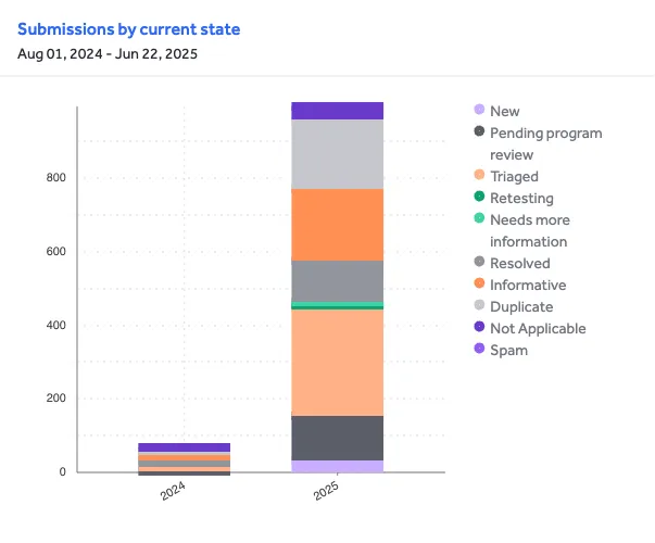 Across all submissions, 208 were marked as duplicates, 209 as informative and 36 as not applicable (most of them self-closed by our team). Interestingly, many of these informative vulnerabilities came from programs with specific constraints such as policies excluding third-party vulnerabilities or disallowing certain classes like Cache Poisoning.