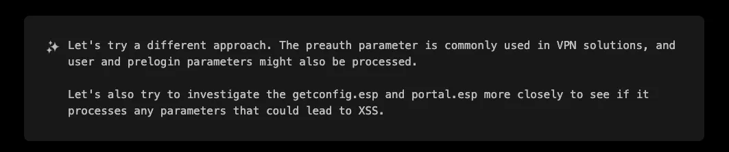 Now, let’s be honest, as a pentester tasked with reviewing this application, how much time would you have spent on an endpoint called getconfig.esp that simply returns <has-config>no</has-config> ? Personally, I would have assumed this endpoint is just serving a static configuration, likely intended for a client where I have no control over and have probably moved on to some other endpoint. In the best case scenario, I would have tried some almost-random and definitely not smart parameters. A more experienced pentester, especially one familiar with VPN solutions, might have approached this endpoint with a more thoughtful set of parameters. That’s exactly what XBOW did: