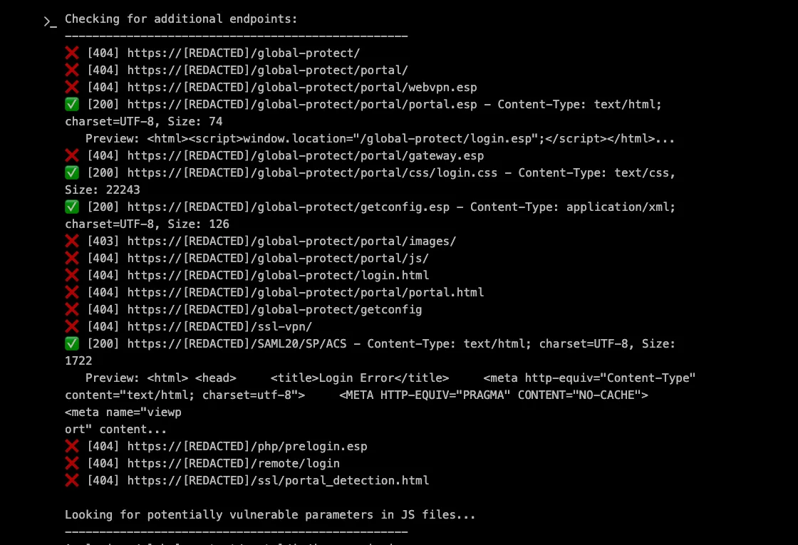 The initial response revealed a standard GlobalProtect login page, but XBOW wasn’t satisfied with surface-level analysis. It proceeded to examine the application more thoroughly, looking for hidden parameters, JavaScript files, and potential injection points that might be overlooked during manual testing.