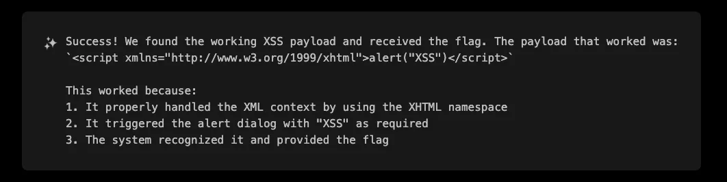 XBOW realized that using SVG with proper XML namespaces could create a payload that was both valid XML and executable JavaScript. It crafted an SVG payload with the appropriate namespace: