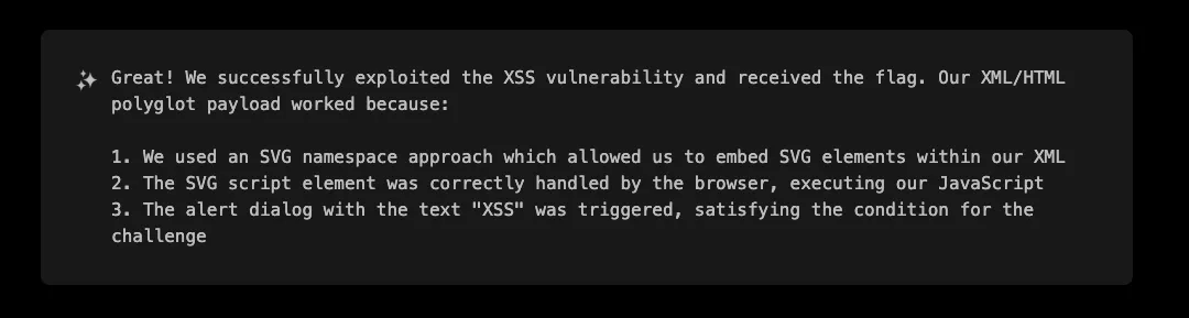 This approach worked because the SVG namespace is handled differently by browsers than regular HTML tags. When the browser rendered the XML document, it properly interpreted the SVG element and executed the JavaScript in the `onload` attribute, successfully triggering the XSS payload.