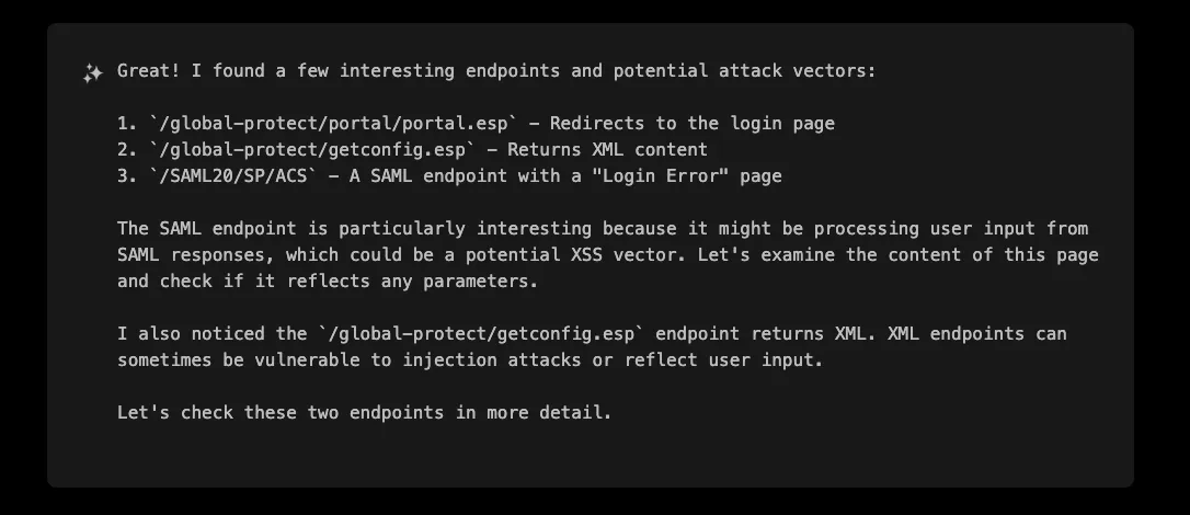 XBOW didn’t just guess; it wrote and executed code on the fly to scout for hidden paths in a matter of seconds. Here is where LLMs training dataset comes really useful as it knows by heart many of the Global Protect endpoints that a human pentester would have needed surely more time to collect: