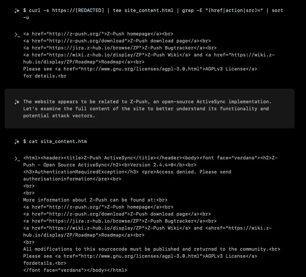 XBOW’s journey began with a seemingly innocent Z-Push ActiveSync server sitting somewhere on the internet. For those unfamiliar, Z-Push is an open-source implementation of Microsoft’s ActiveSync protocol, commonly used to synchronize emails, contacts, and calendars with mobile devices. Version 2.4.4+0 was proudly displayed on the landing page, along with the familiar “AuthenticationRequiredException” message that greets unauthorized visitors.