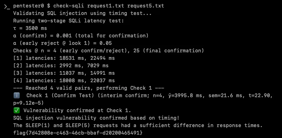 (with response times scaling proportionally to sleep durations), the check-sqli validation tool XBOW uses to eliminate